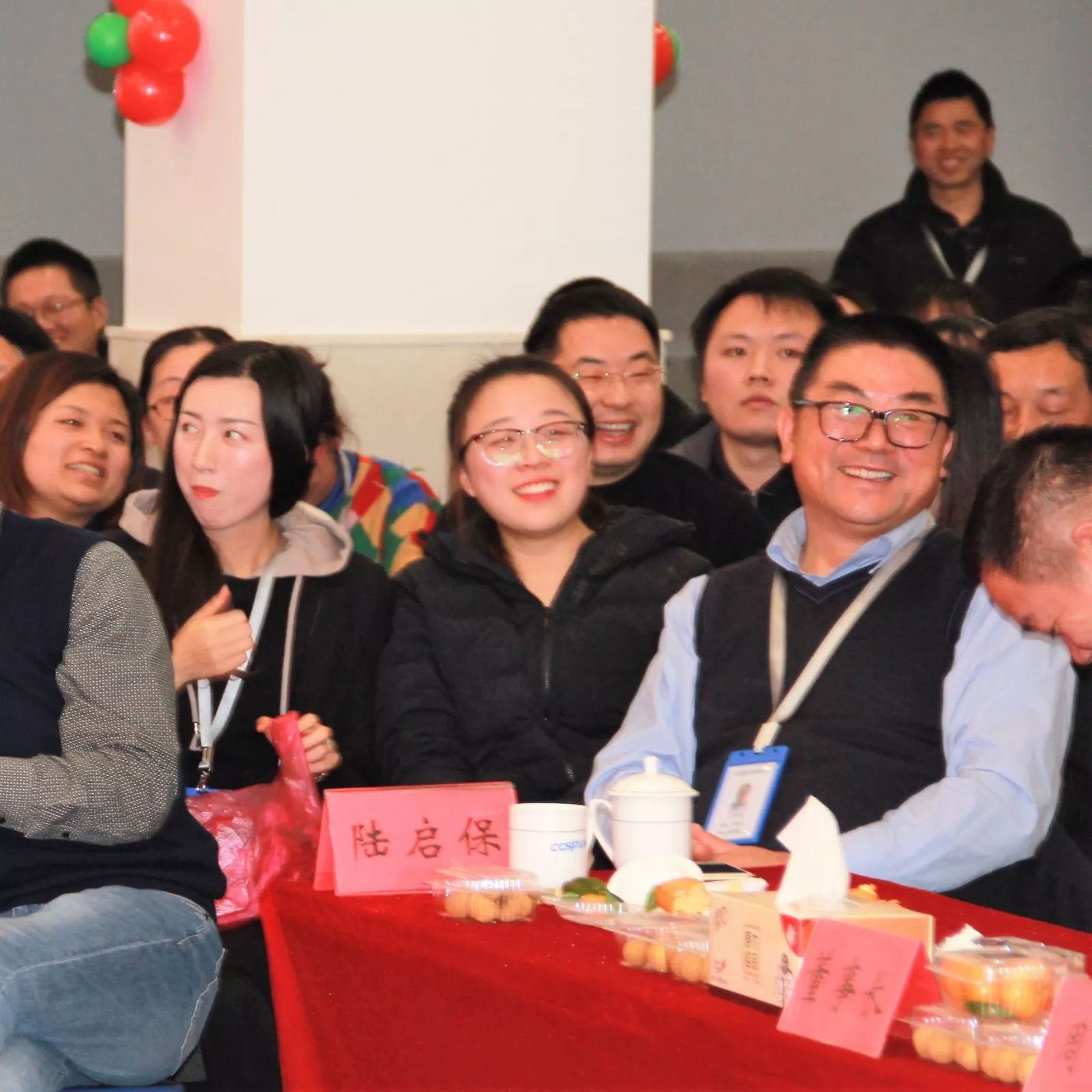 ▲主持人佘小程、谈博介绍联欢会节目 亿能员工济济一堂,欢声笑语,共度佳节。